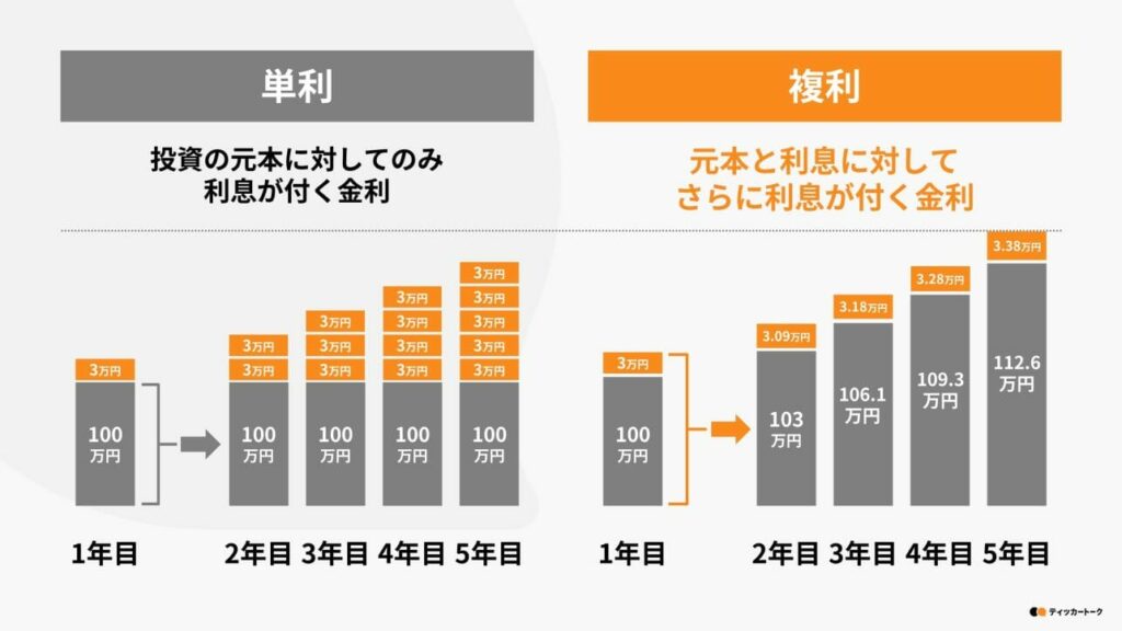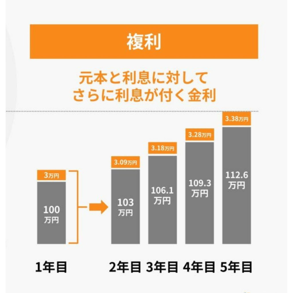 一方で、元々貯金していたお金に「利息」がついて、それを含めた額(上の図であれば103万円)に利息をつける事を、人類最大の発明
